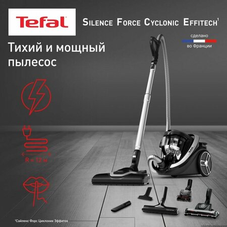 Пылесос Tefal Silence Force — мощность и тишина в одном устройстве. С потребляемой мощностью 500 Вт и уровнем шума всего 59 дБ он обеспечивает эффективную и комфортную уборку. Контейнер на 2 л легко очищается, а автосматывание шнура и радиус действия 12 м делают использование максимально удобным. HEPA-фильтр задерживает мельчайшие частицы пыли и аллергены, а телескопическая металлическая трубка позволяет настроить удобную длину. В комплекте — 6 насадок, включая турбощётку, щётку для паркета и мебельную насадку, что делает модель универсальной для разных поверхностей. Французская сборка, стильный дизайн и гарантия 24 месяца подтверждают качество и надёжность.