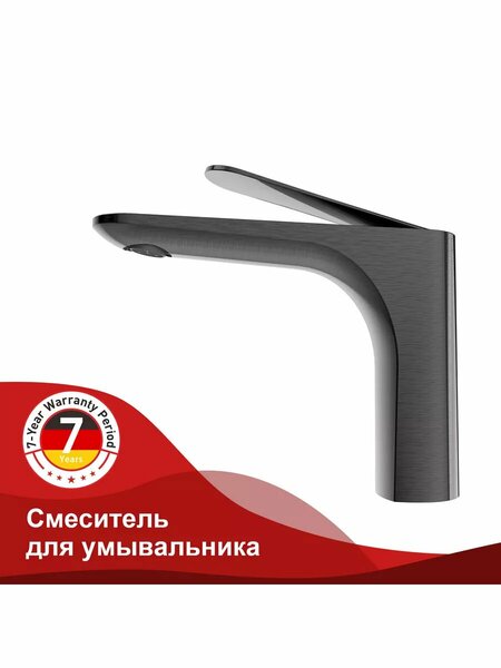 R21.10.09 Смеситель для раковины из латуни в цвете графит. Данный смеситель для умывальника имеет надежный стационарный излив, не меняющий своего положении. Смеситель прекрасно смешивает потоки воды, а помимо этого обладает невысоким показателем шумов. Быстрый монтаж. Крепление на усиленной гайке. Подводка длиной 55 см имеет латунные гайки. Имеет награду Red Dot Award. Гарантия 7 лет. • Материал - латунь • Цвет - графит • Керамический картридж 35мм - R500.35.01 • Аэратор - R540.01 • Гибкая подводка 55см - M10*1-Г1/2 • Крепежная гайка - R599.02