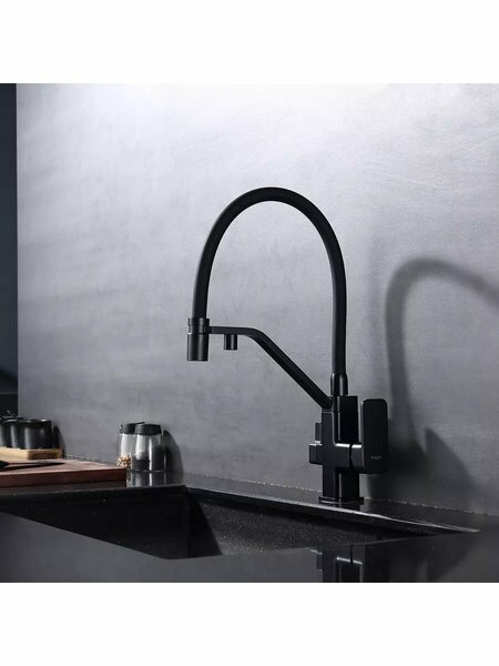 R85.62.06 - смеситель с подключением фильтра для воды для кухонной мойки с гибким черным силиконовым изливом, в черном цвете, с гайкой. Гибкий съемный шланг значительно расширяет зону использования смесителя, благодаря этому можно мыть объемную посуду. Имеет устойчивое покрытие, которое защитит сантехнику от воздействия агрессивных моющих средств, предупреждает появления разводов и пятен. Модель предназначена для одновременного подключения к водопроводу и фильтру и позволяет снабжать как обычной, так и питьевой водой. Испанский картридж эффективно фильтрует примеси и уменьшает шум от импульсов воды. Гладкая внутренняя стенка крана обеспечивает мягкий поток воды. Высококлассная технология делает поверхность яркой и блестящей. За счет особых свойств смеситель остается сияющим долгие годы. • Материал - латунь • Цвет - черный • Керамический картридж 35мм - R500.358 • Переключатель с керамическими пластинами (угол поворота – 90°) - R501.524 • Аэратор - R540.09.06 • Аэратор для фильтрованной воды - R540.724.06 • Переходник для соединения со стационарной системой питьевой воды - R599.11 • Гибкая подводка 55см - M10*1-Г1/2 • Крепежная 1 шпилька - R599.09