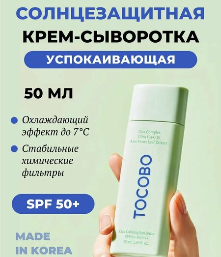 Tocobo Bio Watery Sun Cream SPF50+ PA++++ солнцезащитный крем корейского производства созданный на основе иновационных исследований. Легкий увлажняющий и восстанавливающий спф крем имеет водную основу и высокую степень защиты от ультрафиолета. Содержит в составе 5 фотостабильных безопасных химических фильтров нового поколения: Uvinul A - защищает от лучей спектра UVA; Uvinul T 150 - защищает от UVB-излучения; Polysilicone-15 - защищает от UVB-излучения; Tinosorb S - фильтр широкого спектра действия, защищает от UVA и UVB-лучей; Mexoryl SX - защищает от UVA-лучей. За счет такого состава имеет высокую степень защиты от негативного воздействия ультрафиолета, замедляет процессы старения, предупреждает разрушения волокон коллагена и эластина, защищает от появления пигментных пятен. Косметика корейского производства славится своими натуральными ингредиентами, которые нацелены на сохранение здоровья кожи и ее сияния. Солнцезащитный крем SPF для лица обеспечивает защиту от вредных ультрафиолетовых лучей, предотвращая появление морщин и пигментации. Легкая, комфортная текстура и мягкая, гипоаллергенная формула, на основе натуральных компонентов, поможет успокоить раздраженную кожу и окажет глубокое увлажняющее действие. Для того, чтобы создать максимальную защиту от УФ лучей даже во время активного отдыха, создана формула, сочетающая в себе водную и масляную основы, которые усиливают солнцезащитные свойства. Этот спф крем для лица от бренда Токобо универсальное решение для всех типов кожи: для нормальной, комбинированной, для сухой и чувствительной. Солнцезащитное средство обладает легкой текстурой, которая быстро впитывается и не утяжеляет кожу, не оставляет белого налёта или ощущения липкости после нанесения. Способ применения: на последней стадии ухода нанесите необходимое количество санскрин средства на лицо, шею - равномерно распределив по поверхности кожи. Оказывает выраженное успокаивающее действие, снимает зуд и красноту, борется с воспалениями.