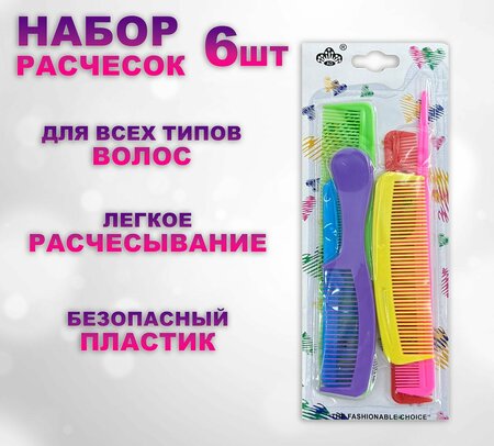 Набор из шести расчёсок - это отличный способ выглядеть обворожительно везде, где бы вы не находились. Полный набор гребней для волос в цветном исполнении станет не только прекрасным украшением вашего туалетного столика, но и поможет аккуратно уложить волосы и сделать идеальный пробор. Сделайте одну расчёску своей домашней «любимицей», а самую миниатюрную можно брать с собой, чтобы при необходимости подправить причёску. Подходят для всех типов волос, включая кудрявые и вьющиеся. В наборе 6 расчесок. Длина расчесок от 11,5 до 18 см.