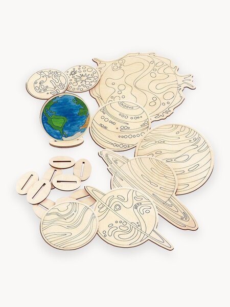 Звездное небо всегда притягивает взгляд, манит своей красотой и таинственностью. Где-то там, среди звезд, есть галактика Млечный Путь, в которой находится Земля и Солнечная система. Звучит таинственно! Неправда ли! Набор планет-раскрасок подарит ребёнку возможность изучить планеты Солнечной системы, самому раскрасить их и украсить комнату по своему усмотрению. В состав набора входит: Солнце, Меркурий, Венера, Земля, Марс, Юпитер, Сатурн, Уран, Нептун и подставки для каждой планеты. Увлекательный вариант для творческого отдыха с детьми. Хорошее решение для художественных и дизайнерских проектов. Набор поможет развить мелкую моторику рук, творческое мышление, зрительную концентрацию. Раскрасить можно гуашью, акриловыми, темперными красками, карандашами, фломастерами. Благодаря продуманному решению, планеты можно разместить как на полке, столе, подоконнике, так и повесить на стену. На подставках можно написать названия планет и расставлять их по памяти. Тактильные ощущения быстрее помогут ребёнку запомнить названия и порядок планет. Материал изготовления – березовая фанера. Размеры: Солнце 15х13см, Меркурий 4,7х4,7см, Венера 6,5х6,5см, Земля 6,4х6,4см, Марс 4,9х4,9см, Юпитер 10х10см, Уран 12х7см, Сатурн 16х8см, Нептун 7х7см Упаковка - фирменная картонная коробка. Варианты раскрашивания и даже целую энциклопедию о планетах Вы можете найти по QR-коду на упаковке. Раскраски из дерева - это по-настоящему богатые возможности для интересной и захватывающей игры. Разве не этого хотят все так хотят в детстве?