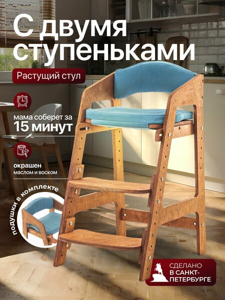 Ищете стул детский, который будет соответствовать потребностям вашего ребенка в течение длительного времени? Растущий стул Непоседа, изготовленный из натурального дерева - это то, что вам нужно! Эта модель подходит для детей в возрасте от 2 лет и до школьного возраста, на рост от 80 до 130 см, поэтому вы можете быть уверены, что ваш ребенок сможет использовать ее в течение многих лет. Стульчик детский подстраивается под рост вашего ребенка, чтобы формировать правильную осанку и предотвращать сколиоз. Это очень важно, особенно для маленьких детей, которые только начинают учиться сидеть за столом. Кроме того, растущий стул детский значительно усилен и выдержит вес до 180 кг. Этот детский стул изготовлен из фанеры толщиной 15 мм, покрыт натуральным маслом, что делает его экологически чистым и безопасным для детей. Кроме того, растущий стул для детей очень мобилен, и ребенок может самостоятельно передвигать его по комнате, если нужно. И если вам нужен детский стол и стул, то у нас в магазине есть также растущий стол и стул для детей. Этот растущий стульчик можно использовать как стульчик для кормления или стул для школьника. Наш растущий стул для школьника и малыша аккуратно упакован в коробку из плотного картона, все детали дополнительно упакованы в крафтовую бумагу. Сборка стульчика очень простая, похожа на сборку конструктора, поэтому вы сможете легко и быстро собрать его самостоятельно. Стул деревянный доступен в нескольких цветах, чтобы вы могли выбрать тот, который лучше всего подойдет для вашего интерьера. В комплекте идет подушка на растущий стул на сиденье и спинку. Чехлы подушек изготовлены из мягкого велюра, а наполнитель выполнен из поролона, что обеспечивает максимальный комфорт вашему ребенку во время еды. Чехлы легко снимаются, их можно стирать. Будьте внимательны. Отрегулируйте высоту и глубину деталей под рост ребенка при сборке.