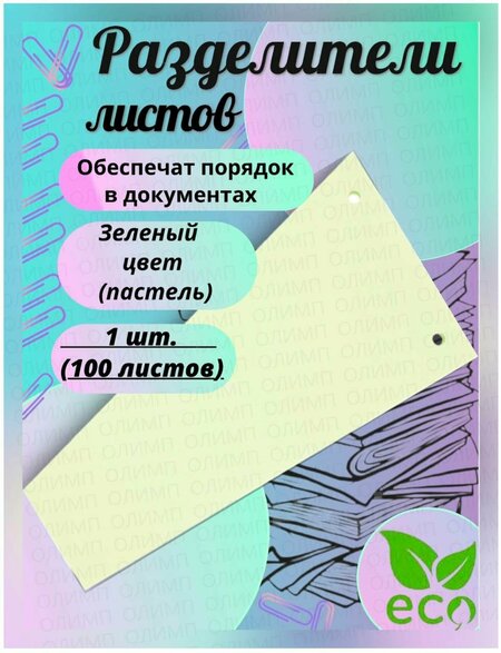 Разделитель листов, зеленый, 100 листов, размер 23×12 см, плотность 160 г/м² — идеальный помощник для организации рабочего процесса и систематизации документов. Этот универсальный продукт идеально подходит для использования в офисах, учебных заведениях и домашних условиях. Особенности разделителя: изготовлен из высококачественной бумаги зеленого цвета; имеет размер 23×12 см, что позволяет удобно разместить листы бумаги; плотность материала составляет 160 г/м², вмещает 100 листов, что делает его экономичным и практичным решением для ежедневного использования. Разделитель станет незаменимым помощником для руководителей, сотрудников, студентов и всех, кто ценит порядок и эффективность в работе с документами.