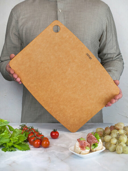 Разделочные доски SYBARIS APOLLO Классические разделочные доски серии APOLLO выполнены из композитного материала FIBER WOOD и являются аналогами таких известных брендов как EPICUREAN, WEBER, VICTORINOX. Доски SYBARIS обладают уникальными характеристиками: 1. Не впитывают запахи 2. Сохраняют остроту ножей 3. Пригодны для мытья в посудомоечных машинах 4. Они долговечны и отличаются высокой прочностью – материал не деформируется и не трескается 5. Выдерживают температуру до 176 ℃ 6. Производятся из экологически чистых натуральных материалов разных цветов 7. Подходят ко всем типам продуктов 8. Рабочая поверхность с двух сторон В лучших ресторанах Мира, на высокопрофессиональных кухнях, неотъемлемым аксессуаром являются доски, изготовленные из древесного волокна FIBER WOOD. Высочайшее качество и долговечность, которых завоевало популярность среди всех ценителей кулинарного искусства! Серия досок SYBARIS APOLLO – совмещает в себе классические прямые и мягкие изогнутые линии. Углы, слегка скругленные для более безопасного пользования, легкий и в тоже время очень надёжный профиль толщиной всего 6мм. Доски SYBARIS представлены в двух цветах – натуральная древесина и классический черный. Для удобства хранения у досок имеется отверстие для подвешивания на крючок. Линейка представлена в трех размерах: S – 29,8*21,5см M – 37*27,5см L – 44*32,5см