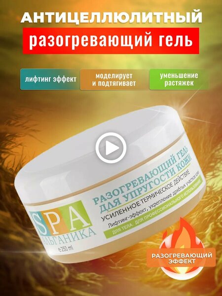 Разогревающий гель от spa Альганика деликатно разогревает кожу, улучшает обменные процессы в глубоких слоях эпидермиса, способствует регенерации, уменьшает растяжки и неровности. Состав компонентов включает в себя вещества интенсивно питающие, смягчающие и увлажняющие кожу. Их действие компенсирует раздражающие способности разогревающих средств и позволяет достичь существенного улучшения упругости и тонуса эпидермиса в короткие сроки применения. Водорослевый комплекс и растительные экстракты обеспечивают разглаживание и укрепление потерявшей тонус кожи, смягчают, повышают плотность и эластичность. Экстракт красного жгучего перца оказывают разогревающее действие и улучшает микроциркуляцию, инициируя процесс расщепления жиров и ускоряя обменные процессы, является эффективным антицеллюлитным средством, способствующим избавлению от «апельсиновой корки». Гель можно использовать в качестве самостоятельного косметического средства, а так же наносить после проведения холодного обертывания для похудения, что усилит эффект от процедуры. Хорошо работает с несовершенствами, помогает от отеков, от целлюлита, от растяжек, эффективен для похудения живота и боков, бедер. Способы применения: -нанести тонким слоем и массирующими движениями на область живота, бедер. Не требует смывания. -на завершающем этапе обертывания нанести небольшое количество на отдельные участки кожи, дать впитаться; -при проведении массажа. Курс массажа с термогелем позволяет избавиться от излишних объемов, придать коже гладкость и упругость. Гель хорошо работает с использованием масла для массажа тела. Для максимального эффекта от спа процедур рекомендуется использовать антицеллюлитный набор косметики: антицеллюлитный скраб для тела и увлажняющий крем для тела линейки спа Альганика. А для антицеллюлитного обертывания используйте пленку для горячего обертывания и термоодеяло. Противопоказанием является варикозное расширение вен, заболевания сердечно-сосудистой системы.