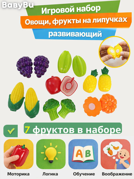 Игровой набор овощи, фрукты на липучках, развивающий набор, 7 фруктов