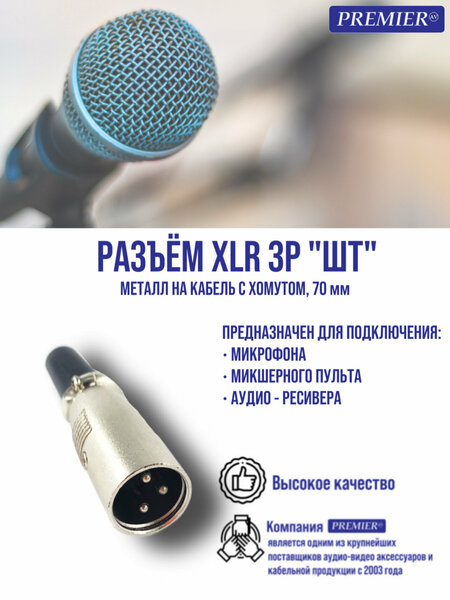 Разъем XLR 3PIN "штекер". Выполнен из металла. На кабель с хомутом (70мм). XLR разъемы XLR разъём это стандартный разъём, который в основном имеет три контакта. Трехконтактный разъём имеет большую область применения и пользуется большим спросом у любителей высококачественной музыки. XLR разъёмы производятся двух видов: в виде вилок и в виде розеток Использует разъём такой метод соединения как, балансное подключение. Часто применяемый в аудио-видео аппаратуре, а также для различного вида светового оборудования. Разъёмы XLR используются для симметричной передачи сигнала. Достоинства XLR разъёма У разъема XLR есть два основных достоинства. Удачное строение разъема XLR (Female), которое даёт возможность присоединить один контакт (земля) с двумя другими, которые передают (сигнал) к разъему XLR (Male). Также достоинство разъема XLR - наружная закрывающееся конструкция на разъёме, которая гарантирует дополнительную степень безопасности и защищенности.