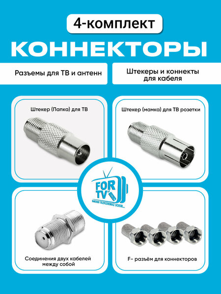 Разъем для ТВ (Папка), разъем для ТВ-розетки (Мамка), разъем для соединения двух кабелей между собой и F-разъем для этих разъемов. Хорошее качество, не снижает сигнал. Остаётся только правильно подключить кабель. Выберите подходящий вам комплект. 1 F-разъем - 2 шт и ТВ-разъем (Папка) - 2 шт. 2 F-разъем - 2 шт, Разъем для ТВ (Папка) - 1 шт. и Разъем для ТВ-розетки (Мамка) - 1 шт. 3 F-разъем – 2 шт. и разъем для соединения двух кабелей между собой – 1 шт. 4 F-разъем - 4 шт, разъем для ТВ (Папка) - 1 шт, разъем для ТВ-розетки (Мамка) - 1 шт. и разъем для соединения двух кабелей между собой - 1 шт.