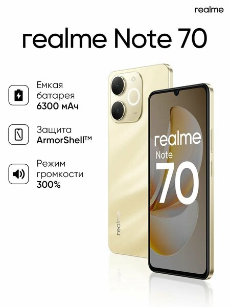 realme Note 70 — это стильный смартфон с большим экраном с частотой 90 Гц. Устройство оснащено ярким и чётким IPS-дисплеем с диагональю 6,74 дюйма и разрешением 1600x720 пикселей, который обеспечивает отличное качество изображения и комфортное использование. Смартфон работает на базе операционной системы Android 15 с фирменной оболочкой realme UI, которая предлагает удобный и интуитивно понятный интерфейс. realme Note 70 оснащен процессором Unisoc T7250 (T615), что обеспечивает быструю и плавную работу устройства. Основная камера 13 Мп с сенсором OmniVision OV13B10 позволит делать качественные и яркие фотографии и видео. Смартфон имеет емкий аккумулятор на 6300 мАч, что обеспечивает длительное время работы без подзарядки.