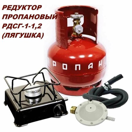 Редуктор газовый пропановый "лягушка" (вход. Гайка 21.8-14/1"LH, ВЫХ. 9ММ). Рабочее давление на входе от 0,07 до 1,6МПа. Редуктор «лягушка» — баллонный одноступенчатый, предназначен для понижения давления газа (пропана), поступающего из баллона и автоматического поддержания заданного рабочего давления постоянным. Пропан. Вход - гайка W21,8-14"LH. Выход - ниппель 9 мм. Вес - 0,31 кг. Подходит для газовых бытовых плит, инфракрасных горелок.