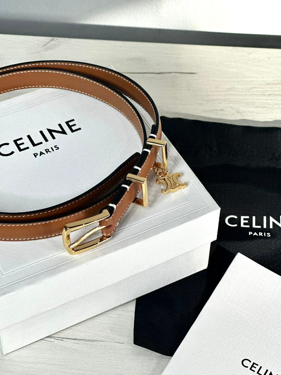 Ремни от французского модного дома CELINE Paris, каждый элегантно уложен на фирменной упаковке бренда. Общие характеристики обоих ремней: Бренд: CELINE Происхождение: Париж, Франция Материал: Натуральная гладкая кожа Фурнитура: Золото, глянцевая полировка Пряжка: Классическая прямоугольная пряжка с язычком Украшение: Подвеска с логотипом CELINE — фирменная эмблема "Triomphe" (двойная арка) Упаковка: Белая фирменная коробка с логотипом, черный тканевый мешочек и документация бренда Цвет кожи: Светло-коричневый (карамельный) Нить: Белая контрастная строчка по краям Фурнитура: Золотистая — пряжка, держатели и декоративный подвес Подкладка ремня: Черная Цвет кожи: Гладкий черный Нить: В цвет ремня — практически незаметная Фурнитура: Золотистая Общий стиль: Более строгий и минималистичный, подходит для классических образов Отличительные особенности: Подвеска "Triomphe" добавляет изысканности и подчёркивает принадлежность к люксовому бренду. Высокое качество исполнения и внимание к деталям делают эти ремни не только аксессуаром, но и элементом статуса. Идеально подойдут как для делового образа, так и для более расслабленного повседневного стиля.