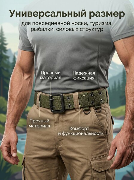Универсальный размер: Ремень тактический, ремень армейский, военный ремень, уставной ремень Преимущества: * Прочное плетение - таким ремнем можно даже тянуть машину; * Прочная стальная двойная пряжка черного цвета; * Универсальный: ремень для брюк, ремень для джинс; * Тактический ремень с 6 рядами отверстий: с люверсами в два ряда по длине ремня; * На данном ремне расположены металлические кольца для размещения гражданского или военного снаряжения - ножей, топоров, кобур, фляг и тд; * При намокании данный пояс не вытягивается и плотно прилегает; * Также данный ремень идеально подойдет для охоты, рыбалки и активных видов спорта.