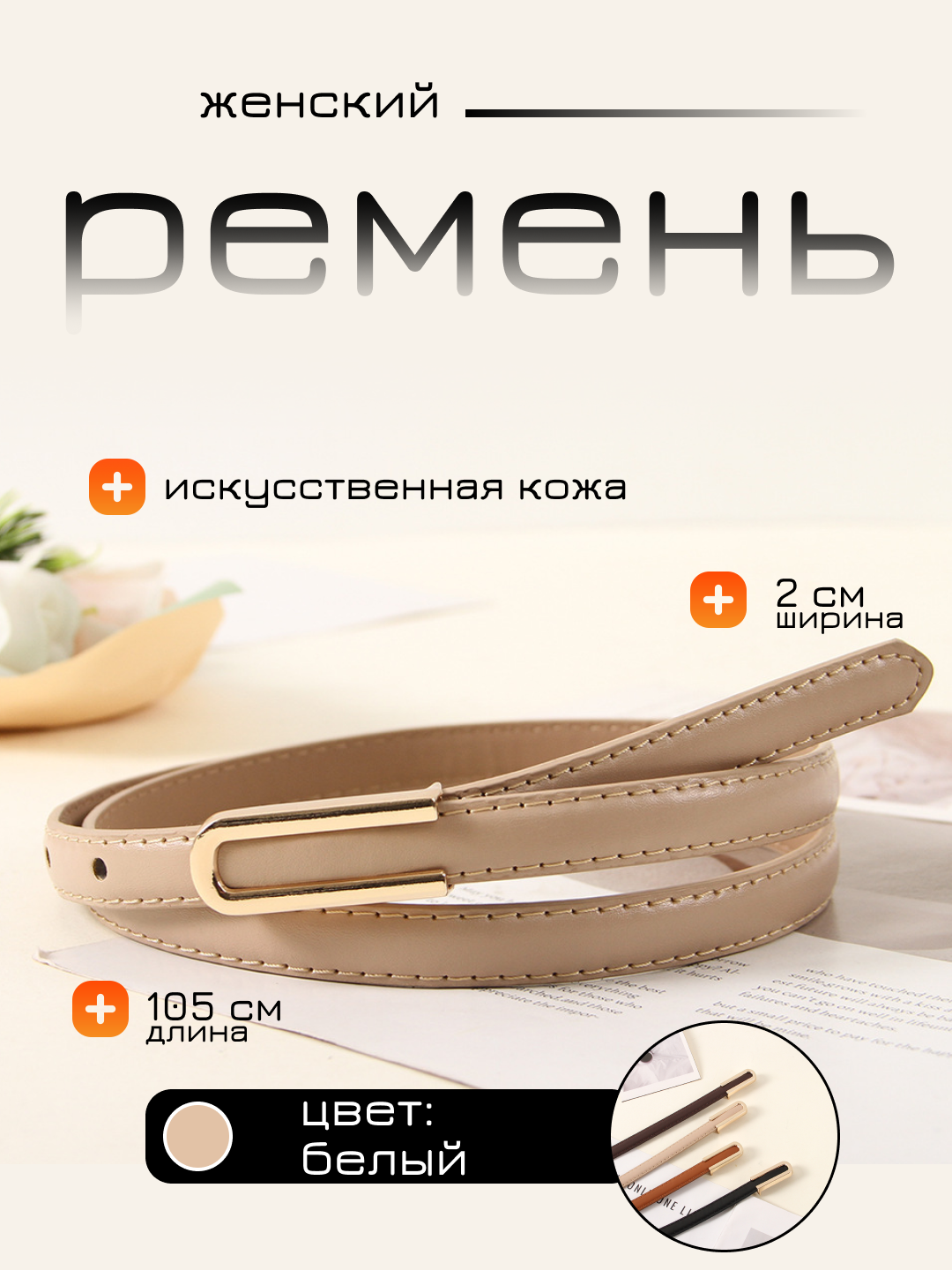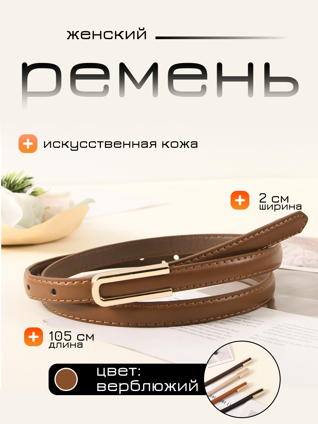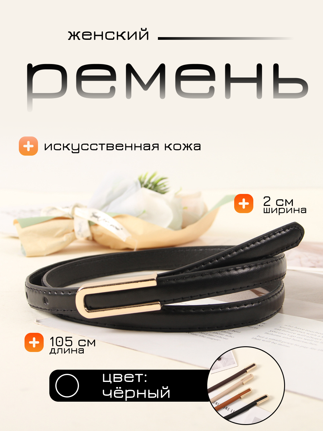 Женский ремень из экокожи с застёжкой Представляем вашему вниманию стильный и удобный женский ремень из экокожи. Этот аксессуар станет незаменимым элементом вашего гардероба, подчеркивая вашу индивидуальность и дополняя как повседневный, так и деловой образ. Ремень выполнен из качественной экокожи, которая обеспечивает долговечность и комфорт в использовании. Застежка на классическом стиле гарантирует надежность и простоту в использовании. Длина ремня составляет 102 см, а ширина – 1,5 см. Выбирая женский ремень из экокожи с застёжкой, вы получаете стильный аксессуар, который станет незаменимым элементом вашего гардероба и подчеркнет вашу индивидуальность.