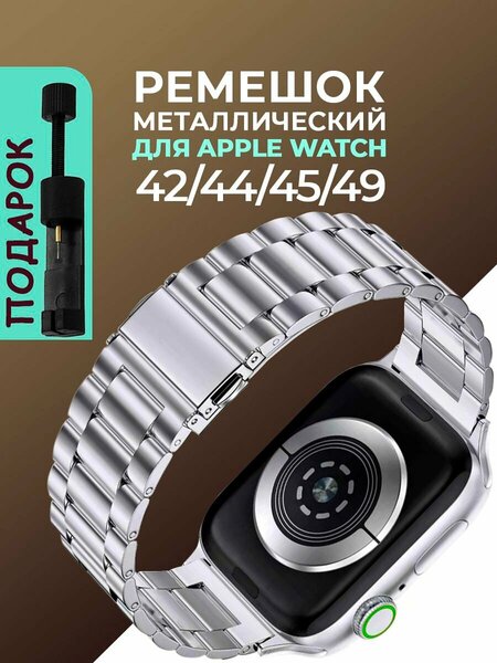 Ремешок для Apple Watch 42 44 45 49 mm совместим с часами серий 1 2 3 4 5 6 7 SE 8 9 Ultra. Массивный браслет из нержавеющей стали, с крупными цельнометаллическими звеньями. Идеально гладкая поверхность. Подходит для умных часов с диагональю 42, 44, 45, 49 мм. Имеет скрытую (невидимую с внешней стороны) раскладную застежку, клипсу-автомат, которая легко и без всяких усилий расстегивается нажатием на две боковые кнопки. Застегивается она так же как обычная клипса - нажатием с последующим щелчком. Укорачивание производится путем снятия звеньев, которые обозначены стрелками, - по три штуки с каждого края. Штифты удаляются только в одну сторону (смотри фото). Эта модель солидно лежит в руке и ощущается на запястье. Металлический ремень для Эпл Вотч не царапает руку, не дергает волоски и не вызывает зуда кожи и потливости. Каждый аксессуар упакован в индивидуальную коробку. Ширина браслета - 23 мм, толщина - 3,6 мм, длина в закрытом состоянии - 180 мм. Вес - 90 гр. Ремешок на Apple Watch 44mm - прекрасный подарок на любой праздник - мужской и женский.