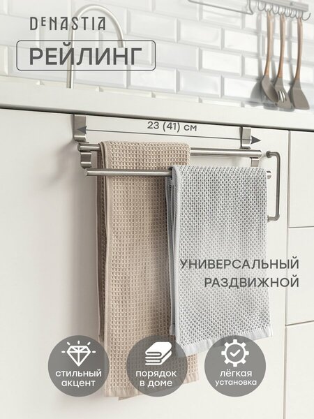 Двойной раздвижной рейлинг - это практичное и быстрое решение для аккуратного хранения вещей. Держатель для полотенец навесной на дверь элегантно и гармонично впишется в интерьер вашей кухни. Изготовлен из нержавеющей стали, рассчитан на толщину дверцы до 2 см. Размер 23х12,5 см, раздвижной механизм позволяет регулировать длину от 23 до 41 см, максимальная длина вешалки 41 см, расстояние между крючками от 19 до 37,5 см. Вес 165 г. Максимальная нагрузка до 2 кг. Материал - нержавеющая сталь.