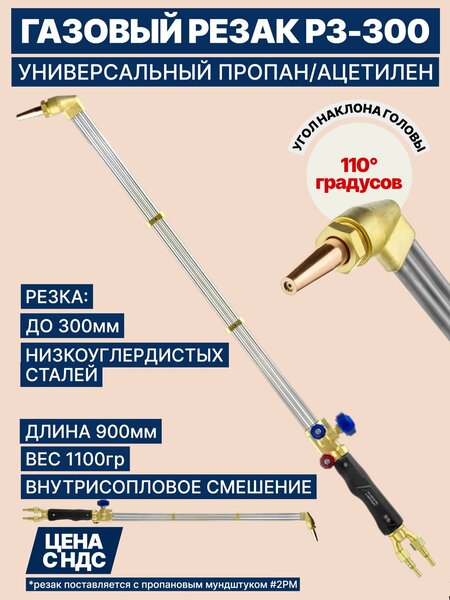 Универсальный вентильный резак для работы на пропане и ацетилене. Возможен рез металл толщиной до 300 мм. Длина резака 900 мм. Угол наклона головки резака 110°. Не требует установки огнепреградительных клапанов. Укомплектован пропановым мундштуком, ниппелями и накидными гайками. Универсальный резак Р3-300 В-МУ, L=900 (110°) внутрисоплового смешения газов предназначен для ручной кислородной резки листового и сортового металлопроката из низкоуглеродистых сталей толщиной до 300 мм. Резак обладает повышенной надежностью конструкции, которая достигается за счет штампованных латунных элементов резака. На резаке установлена ручка из высокотемпературного штампованного пластика, выдерживающая температуру до 200°С, благодаря чему можно работать в тонких рукавицах. Резак может работать на пропане и ацетилене. Выбор газа зависит от установленных газосмесительных мундштуков. Мундштуки имеют три запорных пояска, которые предотвращают перетечку газов и обеспечивают смешение газов непосредственно в мундштуке, обеспечивая безопасное использование. Резак поставляется c разборным пропановым мундштуком №2PM. Давление газа на входе и расход зависит от установленного мундштука. В руководстве по эксплуатации указаны ориентировочные данные. Маркировка разборных пропановых/неразборных ацетиленовых мундштуков и толщина разрезаемого металла: №0PM/0А (3–10 мм) №1PM/1А (8–15 мм) №2PM/2А (15–30 мм) №3PM/3А (30–50 мм) №4PM/4А (50–100 мм) №5PM/5А (100–200 мм) №6PM/6А (200–300 мм) Особенности удлиненного резака Р3-300 В-М: Резак с вентилем кислорода режущего (КР). Угол наклона головки резака в 110° и удлиненная конструкция резака помогут производить работы в труднодоступных местах. Резак не требует установки огнепреградительных клапанов. Резак укомплектован ниппелями, что позволяет использовать резинотканевые рукава с внутренним диаметром 6 и 9 мм без дополнительных переходников, накидными гайками M16х1,5 для подачи кислорода и M16х1,5LH для подачи горючего газа. Товар поставляется в индивидуальной упаковке, что исключает бой и обеспечивает сохранность комплектации во время транспортировки и хранения на складе. Комплектация: Резак Р3-300 В-МУ, L=900 (110°) – 1 шт. Мундштук пропановый №2PM – 1 шт. Ниппель универсальный диаметром 6/9 мм – 2 шт. Гайка накидная M16х1,5 – 1 шт. Гайка накидная M16х1,5LH – 1 шт. Руководство по эксплуатации – 1 шт.