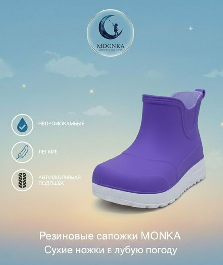 Стильные резиновые сапожки для вашего малыша! Пришла пора веселых прогулок под дождем и по лужам! С резиновыми сапожками ножки вашего ребенка всегда будут сухими и в тепле! непромокаемые: Современный материал надежно защищает от влаги, позволяя активно исследовать мир без ограничений! легкие: Невероятно легкие и комфортные, они не утяжеляют ножку и не мешают бегать и прыгать. Ваш малыш даже не заметит их на себе! антискользящая подошва: Специальный протектор обеспечивает отличное сцепление с любой поверхностью, гарантируя безопасность на мокрой траве или асфальте. Яркий и стильный дизайн: Сочный фиолетовый цвет поднимет настроение в пасмурный день и добавит ярких красок в гардероб! Дайте вашему ребенку свободу исследовать мир, Где каждый шаг – приключение!