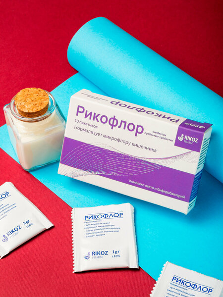 Рикофлор — синбиотический препарат, нормализующий кишечную микрофлору, повышающий количество полезных микроорганизмов и поддерживающий их баланс. Бактерии, входящие в состав препарата: поддерживают физиологическое равновесие кишечной микрофлоры; конкурируют с патогенными и условно-патогенными микроорганизмами; оказывают антагонистическое действие; обогащены лактобактериями и бифидобактериями; поддерживают кислотно-щелочной баланс кишечника, перистальтику и процессы всасывания; способствуют восстановлению клеток кишечной стенки; укрепляют общее состояние иммунитета. Saccharomyces boulardii: подавляет рост патогенных бактерий в кишечнике; предотвращает развитие дисбактериоза на фоне приема антибиотиков; снижает выраженность воспалительных процессов в кишечнике. Инулин: создает благоприятную среду для роста полезных бактерий; способствует нормализации пищеварения; улучшает усвоение витаминов и минералов.