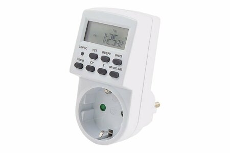 Дополнительные характеристики: Входное напряжение - 220-240 В 50 Гц. Максимальная мощность - 16 А, 3600 Вт. Минимальное время установки - 1 минута. Условия эксплуатации - от 0 до 40°С при относительной влажности от 5 % до 80 %. Условия хранения - от -20 до 80°С при относительной влажности от 5 % до 90 %. Точность часов - ±1 минута в месяц. Аккумулятор - Ni-MH 1,2 В, время работы без заряда >100 часов. Срок хранения не ограничен, срок службы не менее 30000 часов. Высота - вместе с вилкой 84 мм, без учета вилки 43,5 мм. Потребление в режиме ожидания - ≥1 Вт. Вид: в розетку. Тип: недельный/суточный. Номинальное напряжение: 220(230) В. Номинальный ток: 16 А. Max число включений: 20. Min интервал включений: 2 мин. Max подключаемая мощность: 3.6 кВт. Принцип работы: электронный. Цвет: белый. Габариты без упаковки: 100х47.5х84 мм.