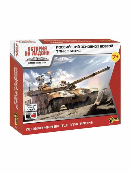 Сборка без клея. Возраст 7+ Масштаб 1:100 Детали х 20 Размер, см 9,5 Сборная модель - Российский основной боевой танк Т-90МС Историческая справка: Впервые макетный образец Т-90МС "Тагил" с башней новой конструкции был продемонстрирован 7 декабря 2009 г. премьер-министру В. В. Путину перед совещанием о развитии российского танкостроения, которое прошло в «танковой столице» России – городе Нижний Тагил. Макет представлял собой стандартную платформу Т-90С с установленной на ней башней принципиально новой конструкции. Модернизация коснулась всего комплекса характеристик Т-90С и позволила значительно повысить его боевые и эксплуатационные возможности. Второй закрытый показ Т-90 МС состоялся в рамках выставки "Оборона и защита" в июле 2010 г. Набор деталей из пластмассы для сборки одной модели танка. Состав набора: отливки инструкция по сборке цветной вкладыш