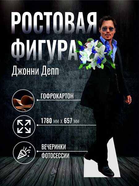 Ростовая картонная фигура "Джонни Депп с цветами" станет ярким акцентом в любом интерьере и на мероприятиях. Выполненная с тщательной проработкой деталей, фигура изображает знаменитого актера в характерном стиле, что делает её идеальным выбором для фанатов и ценителей искусства. Высота фигуры составляет 178 см, благодаря чему она легко привлекает внимание и создает эффект присутствия. Эта фигура идеально подойдет для оформления различных мероприятий, включая вечеринки, выставки, фотозоны и даже тематические события. Установив фигуру в холле, кафе или на домашнем празднике, вы сможете создать атмосферу творчества и праздника. Фигура дополнена яркими цветами, которые символизируют жизнерадостность и креативность. Это делает её особенно привлекательной для празднования дней рождения, юбилеев и других торжеств. Гости обязательно оценят возможность сфотографироваться с любимым актером! Ростовая картонная фигура легкая и удобная в использовании, её легко установить и демонтировать. Она не занимает много места при хранении, что делает её практичной покупкой. Не упустите возможность добавить стильный элемент в ваш декор! Закажите фигуру "Джонни Депп с цветами" и сделайте ваш праздник по-настоящему незабываемым! Это отличное решение для всех, кто хочет порадовать себя и своих близких яркими моментами и воспоминаниями.