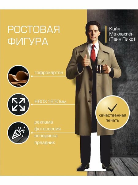 Хотите провести весело корпоратив, ростовая фигура Кайл Маклахлен поможет Вам, она украсит Вашу фотозону и будет самым лучшем местом на празднике, также не оставит равнодушным поклонников. Ростовая фигура Кайл Маклахлен от бренда "Зеленый перец" - это уникальный предмет для коллекционеров и поклонников актера. Эта картонная фигура выполнена в полный рост, что делает ее идеальным аксессуаром для фотосессий или как элемент декора в комнате. Фигура изготовлена из качественного картона, что обеспечивает ей прочность и долговечность. Упаковка представлена в картонной коробке, что удобно для хранения и транспортировки. Эта ростовая кукла - отличный подарок на день рождения или любой другой праздник, который порадует любого фаната Кайла Маклахлена.