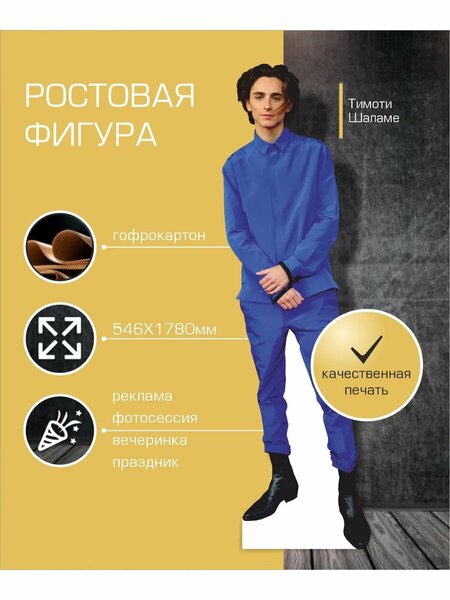 У Вас праздник, день рождения или корпоратив, ростовая фигура Тимоти Шаламе украсит Вашу фотозону, подарит много положительных эмоций и порадует поклонников кинематографа. Она удобна в использовании и транспортировки, не занимает много места, а впечатления от фотосессии будут только положительные. Ростовая фигура Тимоти Шаламе от бренда "Зеленый перец" представляет собой уникальное и забавное изделие, которое станет настоящим украшением любой коллекции или мероприятия. Эта картонная фигура в полный рост изготовлена с высоким вниманием к деталям, что позволяет точно воспроизвести образ известного актера. Фигура идеально подходит для организации фотосессий, создания уникальных кадров или как подарок на день рождения, добавив веселье и оригинальность любому событию. Благодаря прочной и качественной картонной конструкции, ростовая фигура легко транспортируется и может использоваться в различных условиях. Не содержит элементов питания, что делает ее безопасной для всех возрастов.