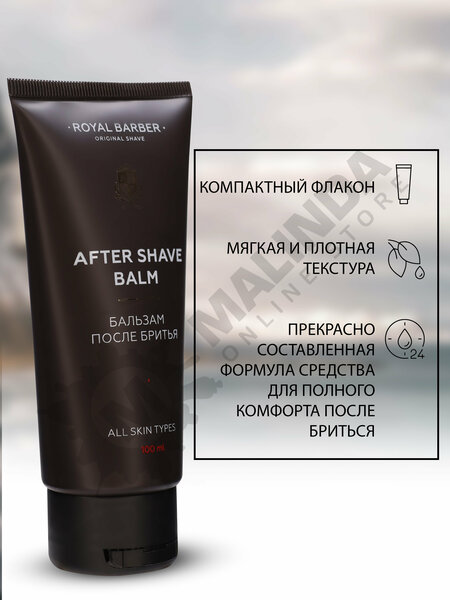 ROYAL BARBER Бальзам после бритья: эффективное средство для чувствительной кожи ROYAL BARBER Бальзам после бритья, 100 мл, представляет собой уникальное средство для ухода за кожей после бритья. Благодаря своей формуле, бальзам эффективно снимает раздражение и покраснение чувствительной кожи, увлажняет, питает и успокаивает ее. Состав бальзама включает в себя органические и натуральные компоненты, такие как масло сладкого миндаля, масло ши, глицерин и другие. Это делает его подходящим для всех типов кожи и обеспечивает глубокое увлажнение и питание. Применение бальзама простое и удобное: нанесите небольшое количество средства на кожу лица массирующими движениями сразу после бритья. Бальзам подходит только для наружного применения и не содержит спирта. ROYAL BARBER Бальзам после бритья обеспечивает качественный уход за кожей после бритья, снимает раздражение и покраснение, увлажняет и питает кожу, подходит для всех типов кожи и содержит натуральные и органические компоненты.
