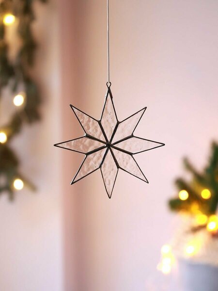 Лимитированная коллекция Вифлеемская звезда. Рождественское украшение. Изготовлена из художественного фактурного стекла, цвет металла под серебро. Ручное изготовление-витраж техника"Тиффани" Размер изделия от "от луча до луча" 12,5 х 12 см. - Упаковка: транспортировочная коробка из гофрокартона. При получении продукции из стекла в ПВЗ или у курьера проверяйте все стеклянные изделия на целостность. Изделие не должно быть со сколами, трещинами, царапинами или разбито. В противном случае претензии на возврат приниматься не будут.