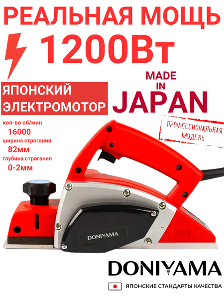 Исключительно надёжная И проверенная модель, японский электромотор 1200 Вт +Лицензионное производство +Основные комплектующие произведены в Японии. Коротко о рубанке Простой в использовании и очень надёжный рубанок электрический по дереву. Рубанок электрический оснащён пылезащищённым японским электромотором с бронированным статором и ротором, обмотки выполнены из меди что гарантирует долговечность работы электромотора и защищает от перегрузок, опилок и пыли. Рубанок поставляется в комплекте с ножами выполненными из японской стали. Арамидный приводной ремень на электрорубанке служит до 10 раз дольше обычного. Рубанок очень лёгкий - 2,5 кг и тихий 30 дБа . На рубанок электрический можно установить любые ножи. Двухсторонняя установка ножей ( два ножа на оси) обеспечивает исключительную чистоту строгания. V - образный паз в литой подошве рубанка облегчает выборку четверти. Боковой упор можно установить с любой стороны корпуса рубанка. Благодаря мощному и высокооборотистому электромотору рубанок очень чисто обрабатывает поверхность. Рубанок электрический по дереву оснащён незасоряемым выбрасывателем опилок особой конструкции. Характеристики Мощность- 1200 Вт Скорость вращения фрезы (макс.)- 16000 об./мин. Ширина строгания- 82 мм Глубина строгания- 0-2 мм Подошва из литого алюминия с V-образными пазами на передней платформе Функция выборки фальца Глубина выборки фальца 12,5 мм Регулятор глубины строгания Наличие блокировки кнопки включения. Параллельный упор. Быстрая замена щёток ( без необходимости разбора инструмента) Длина кабеля - 2 м Сеть- 220 Вт / 50 Гц гарантия - 1 ГОД DONIYAMA - японские сандарты качества. DONIYAMA это лицензионное производство той самой надёжной японской техники, что радовала потребителей по всему миру в 80-е, 90-е и 2000 – е годы! Под брендом DONIYAMA не производят дешевых копий или тем более откровенных подделок которыми к сожалению в наши дни наполнен рынок. DONIYAMA – это лицензионное производство в строгом соответствии с технологией и под пристальным техническим контролем японских специалистов. Основные комплектующие произведены в Японии. Сборочное производство размещено у проверенных лицензированных подрядчиков выполняющих сборочное производство для японских корпораций. Вся продукция DONIYAMA сертифицирована и полностью соответствует японским индустриальным стандартам. А так как все модели DONIYAMA производятся по лицензии и уже давно окупили затраты на разработку, DONIYAMA предлагает то самое легендарное японское качество, но по доступной цене! Комплектация Элетрорубанок Боковой упор Фиксатор бокового упора Адаптер для заточки ножей Калиьр/шаблон для установки ножей Ключ для фиксации ножей Комплект запасных щёток Паспорт Мешок для пыли не предусмотрен – так как рубанок оснащён незасоряемым выбрасывателем
