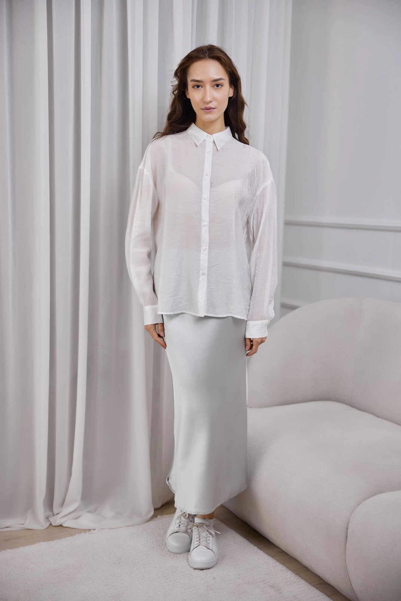 Расслабленная рубашка свободного кроя с объемными длинными рукавами и смелым разрезом на спине. Идеально дополнит многослойный образ с топом, футболкой или лонгсливом.