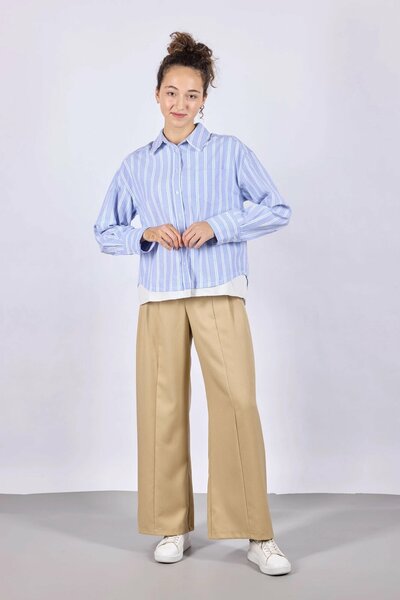 Рубашка из комбинированной ткани в полоску с накладным нагрудным карманом — оригинальная и стильная модель. Контрастный дизайн добавляет образу динамичности, а свободный крой обеспечивает комфорт. Идеально подходит для повседневных и деловых луков.