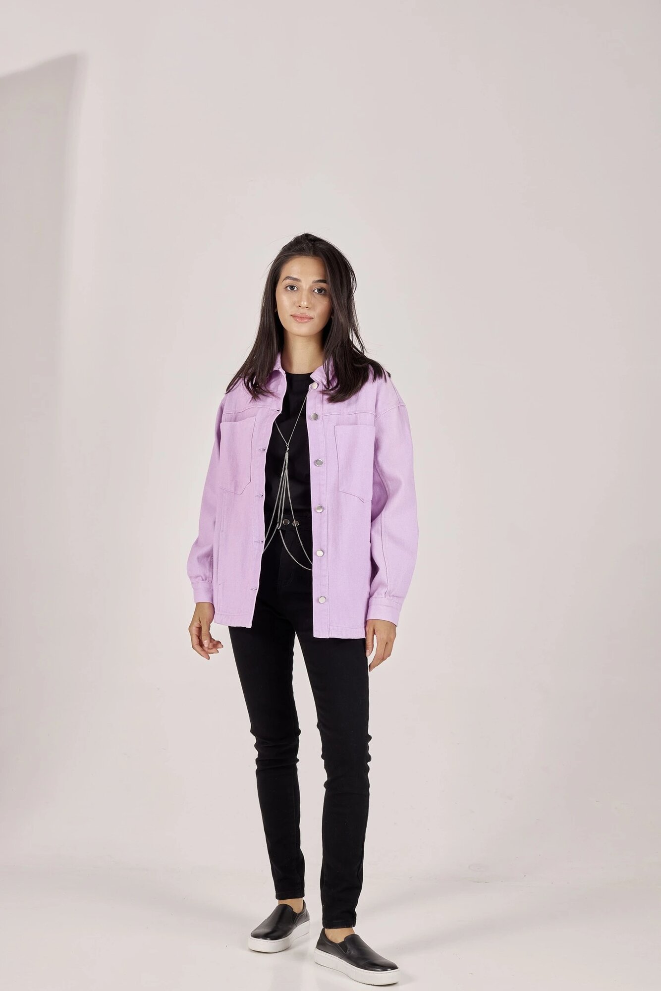 Рубашка прямого кроя, выполненная из плотного хлопкового материала. Модель имеет длинные рукава, два накладных кармана и застежку на блестящие металлические пуговицы. Носите как самостоятельно, так и комбинируйте в многослойных образах.