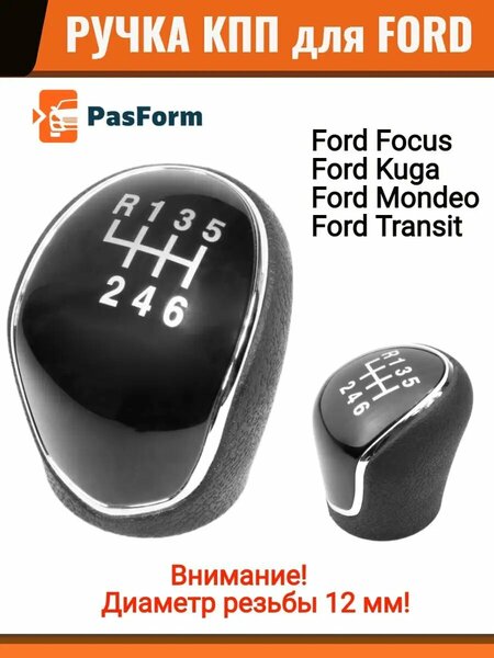 Ручка коробки переключения передач (КПП) подходит для автомобилей Ford Форд 6 ступеней. Внимание! Монтаж ручки с помощью резьбы 12 мм ( проверьте диаметр т. к. резьба может быть 12 и 14 мм) . Внимание! Подходит не на все комплектации! Подходит для определенных комплектаций: Ford C-MAX I Год выпуска: 2007-2010 Ford C-MAX II выпускаемые с 2010 года Ford Focus Mk2 FL (рестайлинг) Форд фокус 2 фф2 год выпуска: 2007-2011 Ford Focus Mk3 Форд фокус 3 фф3 выпускаемые с 2010 года Ford Galaxy II Форд Гэлакси Год выпуска: 2006-2015 Ford Galaxy III выпускаемые с 2015 года Ford Grand C-MAX выпускается с 2010 года Ford Kuga I Форд Куга Год выпуска: 2008-2012 Ford Kuga II выпускаемые с 2012 года Ford Mondeo Mk4 Форд Мондео год выпуска: 2007-2015 Ford Mondeo Mk5 модели производства от orku 2014 Ford S-MAX I Год выпуска: 2006-2015 Ford S-MAX II выпускается с 2015 года Ford Transit VI Форд транзит выпускаемые с 2014 года Ford Transit Connect Форд Транзит Коннект выпускаемые с 2013 года Ford Transit Custom / Tourneo выпускаемые с 2012 года Вторым после руля элементом постоянного тактильного контакта водителя является рычаг переключения передач. Эта небольшая деталь играет важную роль в создании комфорта. Ручка КПП (она же "набалдашник рычага коробки передач" или "розочка рычага КПП" – это: Внешний вид и эстетика салона автомобиля. Правильно подобранная рукоятка подчеркнет стильный интерьер автомобиля Эргономика управления. Особенно это ощущается для любителей динамичной езды – удобная ручка рычага КПП влияет на управление Выражение вкуса и темперамента владельца автомобиля. Ручка переключения механической КПП для многих автомобилистов намного больше чем просто «элемент рычага переключения передач.