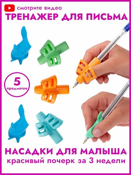 Набор насадок на ручки и карандаши из 3 насадок-бабочек и 2 насадок-дельфинов! Оригинальные насадки для детей, разработанные специалистами помогут ребенку научиться правильно держать ручку и карандаш, при этом формируя красивый почерк. Тренажеры для письма подходят для всей канцелярии для школы, как для левши, так и для правшей, они мягкие и приятные на ощупь, ребенок сам захочет научиться писать с ними, они выглядят как детские игрушки. Детская ручка не будет уставать, а процесс рисования и писания будут легким и интересным. Насадки подойдут на набор цветные карандаши, ручки пиши стирай гелевые и шариковые, фломастеры, двухсторонние скетч маркеры капиллярные и спиртовые, канцелярия для школы,- на все это подходят наши насадки. Веселые разноцветные насадки для мальчика и девочки очень нравятся детям. Тренажер по чистописанию - это отличный подарок мальчику и девочке, сыну, дочке, внуку и внучке по любому поводу на любой праздник: Новый год, день рождения, Рождество, день знаний. В других карточках мы скомплектовали насадки в пенал, где кроме насадок еще поместятся школьные принадлежности набор ластик, стерка, линейка, ну а дневник и тетради только в портфель или рюкзак для первоклассника. Канцтовары для школы это стоит приобретать заранее. Использование тренажеров для письма поможет избежать боли руки при письме, мозолей на пальцах и даже искривления позвоночника. Очень важно когда ручка держится правильно в самом начале учебы вашего малыша. С использованием специальных насадок обучение легкое, веселое и быстрое. Набор тренажеров для письма подходит детям от 3х до 12 лет. Тренажеры для письма на карандаш - это отличный подарок ребенку к началу обучения в школе или в детском саду!