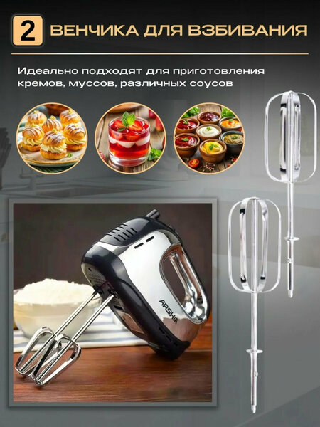 Ручной миксер Sokany: Ваш главный помощник на кухне! Ручной миксер известного бренда Sokany – это идеальное сочетание мужественности, элегантного дизайна и долговечности. Он специально разработан для тех, кто ценит комфорт и приготовление десертов, выпечек и соусов. Основные характеристики и преимущества: 1. Премиальный материал (нержавеющая сталь): Корпус миксера изготовлен из высококачественной нержавеющей стали и прочного пластика. Это гарантирует долговечность, устойчивость к коррозии и эстетичный внешний вид, который украсит любую современную кухню. 2. Многоступенчатая регулировка скорости: Миксер имеет 5 скоростных режимов, что позволяет гибко адаптироваться к вашему любимому рецепту: Низкая скорость: Идеально подходит для точного смешивания сухих ингредиентов (муки, порошка) без пыли. 1. Высокая скорость: позволяет готовить яйца, возможно, даже до хрустящей корочки, и за несколько минут замесить густой сливочный крем. 2. Эргономичная и производительная конструкция: удобная ручка позволяет долго работать с миксером без особых усилий. Специальная конструкция позволяет размещать миксер вертикально на столе и во время перерывов поддерживать рабочую поверхность в чистоте. 3. Эффективная система охлаждения: в верхней части корпуса предусмотрены вентиляционные отверстия, которые предотвращают перегрев двигателя даже при интенсивных нагрузках, продлевая срок службы устройства. 4. Универсальные насадки и принадлежности: Для венчиков: позволяет взбивать белков, сливок и легкие кремов. Пара крючков (спираль): Для замешивания густого теста (песочного или дрожжевого). ✅ Почему стоит выбрать Соканы? Скорость и мощь: Экономист и время, обеспечивающие идеальную последовательность блуда. Безопасность: кнопка «Извлечь» позволяет быстро и безопасно искать файлы для сохранения пароля. Надежность: Торговая марка Sokany зарекомендовала себя как качественная и доступная бытовая техника. Что можно приготовить? Создадите с помощью моего миксера: Воздушные бисквиты и кексы; Домашний майонез и нежные соусы; Безе, зефир и профессиональные кондитерские кремы; Молочные коктейль и мусс.