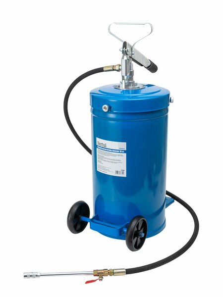 Ручной нагнетатель смазки 16 кг. VR50414 Ручной переносной нагнетатель смазки, емкость 16 кг Это специализированное устройство предназначено для быстрого и эффективного нанесения смазочных материалов на узлы и агрегаты транспортных средств и других механических устройств в процессе технического обслуживания. Основные особенности прибора включают: Особенности конструкции Металлическая трубка: Обеспечивает прочность и долговечность устройства. Смазочный шланг: Гибкий элемент, обеспечивающий удобство подачи смазки в труднодоступные места. Резервуар объемом 16 кг: Позволяет хранить значительное количество смазочного материала, сокращая необходимость частого пополнения емкости. Принцип работы Нагнетатель создает высокое давление, обеспечивая эффективную подачу больших объемов смазочных материалов. Это позволяет значительно сократить время, затрачиваемое на обслуживание оборудования, и повысить качество выполняемых работ. Колеса добавляют маневренность и удобство перемещения по рабочей зоне. Применение Устройство широко используется в автосервисах, ремонтных мастерских и производственных предприятиях для смазки подшипников, шаровых опор, втулок и других деталей автомобилей и промышленных машин. Таким образом, ручной переносной нагнетатель смазки является важным инструментом для техобслуживания и ремонта техники, способствующим повышению эффективности процессов и продлению срока службы механизмов. Характеристики: Объем бака: 16 кг. Длина шланга: 1500 мм.