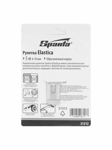 Рулетка Sparta «Elastica» 31312 с лентой 5 м х 18 мм, в обрезиненном корпусе, — это универсальный инструмент для измерения длины заготовок, различных поверхностей, мебели, дверных и оконных проемов и т. д. Она будет полезна в быту, на даче, в гараже, в мастерской. Благодаря окошку на зацепе ее также можно использовать в качестве циркуля. Преимущества: Надежность и долговечность конструкции рулетки достигается за счет обрезиненного пластикового корпуса и возвратной пружины. Лента покрыта защитной краской, таким образом достигается ее износостойкость. Рулетка оснащена механическим стопором, благодаря которому ленту можно удерживать на нужной длине. Плавающий зацеп позволяет производить измерения с точностью до миллиметра. Толщина ленты составляет 18 мм, что позволяет работать в труднодоступных местах. Шкала, нанесенная крупными символами, легко читается даже на расстоянии. Три заклепки надежно фиксируют зацеп на ленте Бренд: SPARTA Группа товаров: Ручной инструмент Материал: сталь Длина, м: 5 Особенности: обрезиненный корпус Страна производства: Китай Измерительная шкала: метрическая Ширина ленты, мм: 18 Материал ленты: сталь Комплектация: Рулетка - 1 шт