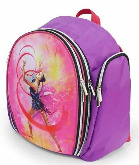 Это рюкзак для гимнастических предметов. Вместительный, для детей от 5 лет. Боковые карманы отлично подойдут для хранения лент и булав, а мяч можно положить внутрь рюкзака. Плечевые регулируемые лямки усилены. Рюкзак уплотнён мягкой прокладкой. Рюкзак изготовлен из прочного материала с водоотталкивающей пропиткой. Внутри рюкзака имеется бирка для указания имени гимнастки на случай потери.