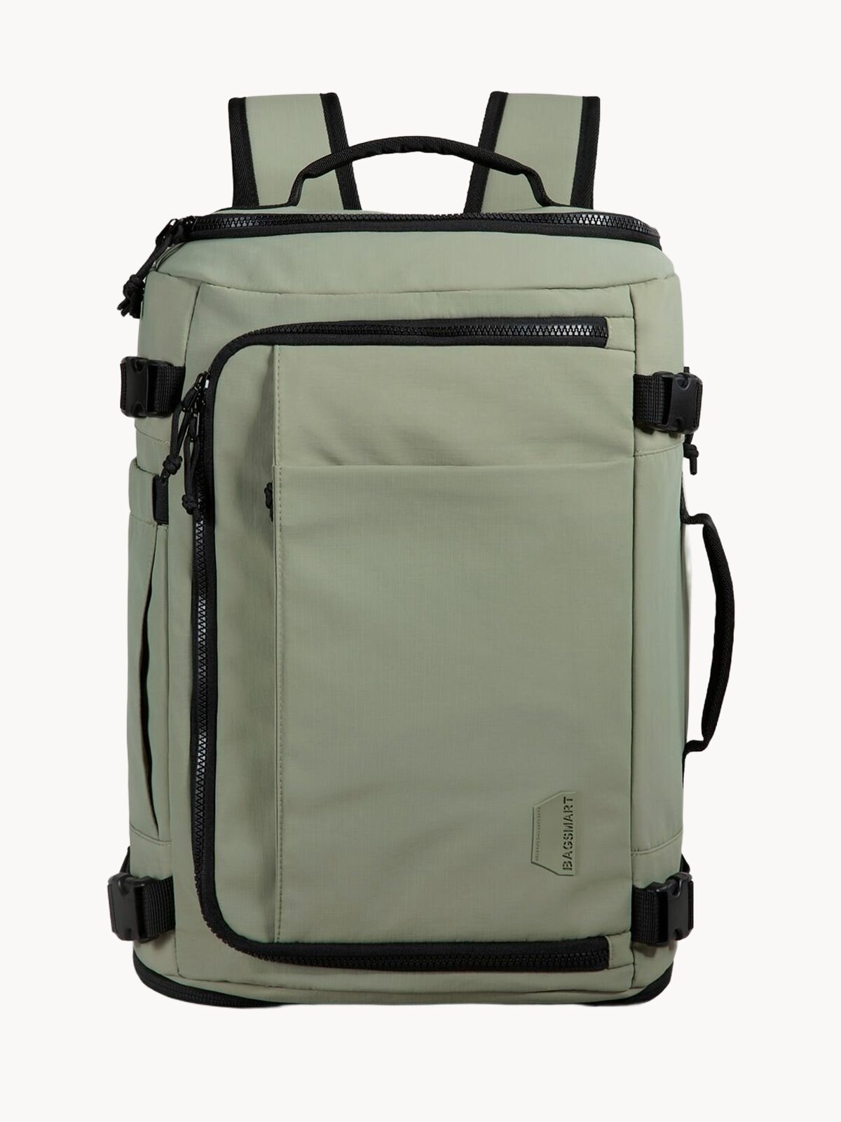 Рюкзак Bagsmart. Бренд Bagsmart уделяет особое внимание комфорту, практичности и упорядоченности: каждый продукт данного бренда идеально подходит для путешествий, организации хранения и просто поддержания порядка. Предлагая широкий ассортимент сумок, рюкзаков и органайзеров, продукция Bagsmart сможет порадовать даже самого избирательного покупателя. Хранение: Шесть внешних карманов для быстрого доступа к вещам во время путешествия. Отсек для ноутбука и другой техники вмещает ноутбук до 15.6". Дополнительное отделение для обуви. Одобрен авиакомпаниями: Этот рюкзак соответствует размерам, требуемым почти всеми крупными авиакомпаниями для ручной клади и помещается в верхнем отсеке и под сиденьем. 4 способа переноски: Рюкзак оснащен двумя ручками - сверху и сбоку, а также дополнительным ремешком под ручку чемодана на спинке. Мультифункциональность: Этот рюкзак идеально подходит для поездок на 4 - 6 дня, деловых поездок, кемпинга и т. д. Объем - 38 литров. Вес - 900 г, Размер рюкзака - 42х31х25,5