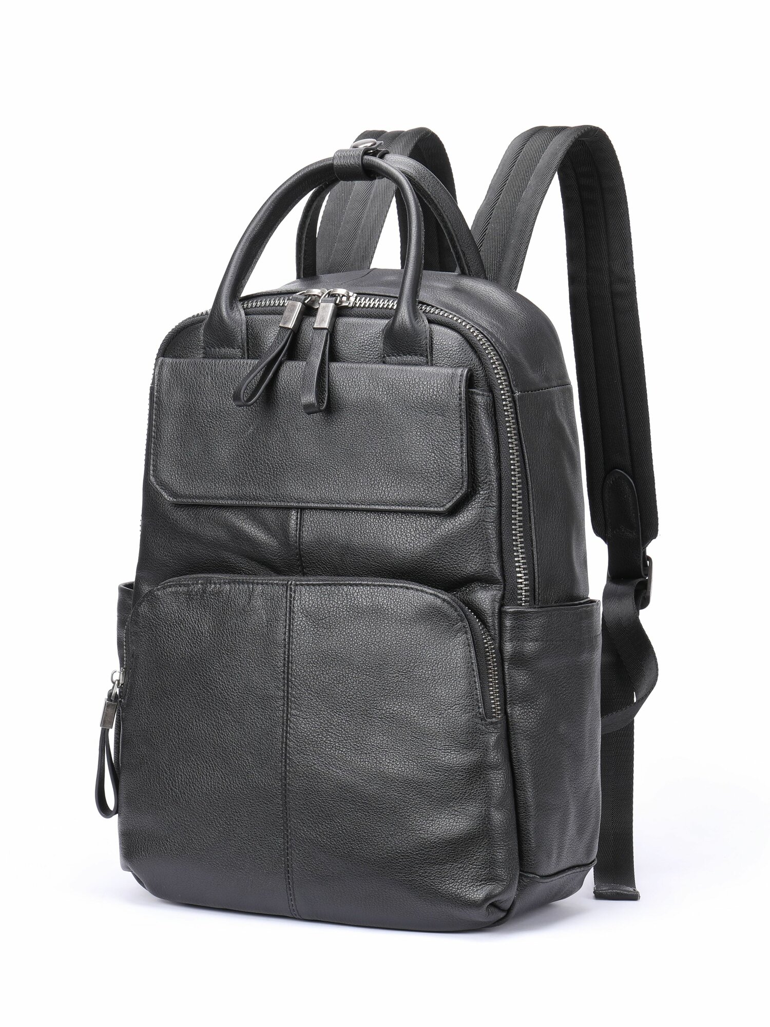 Городской рюкзак унисекс из натуральной кожи для мужчин и женщин. Этот практичный стильный аксессуар подойдет для повседневной носки, для офиса, путешествий, работы, учебы, школы и активного отдыха. Кожаный рюкзак имеет 2 отделения, закрывающихся на молнию. Основное большое отделение вмещает ноутбук с диагональю экрана до 14", документы формата А4, необходимые вещи. Внутри есть два открытых кармана для аксессуаров (подойдут для смартфона, бумажника и ключей), а также большой карман на молнии для ценных вещей. Спереди второе отделение и два внешних кармана на молнии. Сзади расположен небольшой потайной карман на молнии. Лямки рюкзака регулируются по длине, есть ручка для ношения одной рукой. Дорожный рюкзак можно брать с собой в путешествие или командировку, он вместительный и не промокает. Подойдет для ручной клади в большинство авиакомпаний. Удобная ручка позволяет носить рюкзак не только на плечах, но и в руке. Мультиспортивный рюкзак можно использовать для фитнеса, гимнастики, плавания и других видов спорта. Идеально подойдет для офиса, школы, а также студентов колледжа, института. Черный кожаный классический рюкзак для ноутбука функционален, прекрасно впишется в любой образ - взрослый, молодежный, подростковый, бизнес или деловой.