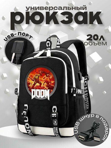 Рюкзак Дум (Doom), внутри рюкзака есть несколько отделений. Подойдет для школы, университета и повседневного ношения. На боковой поверхности рюкзака есть USB вход для наушников и зарядки (провода идут в комплекте). Особенности: дышащий материал, снижает нагрузку на плечи и спину. Объем: 35 л. Маркировка: Ichi. Размер: 44*30*15 см. Цвет: Черный