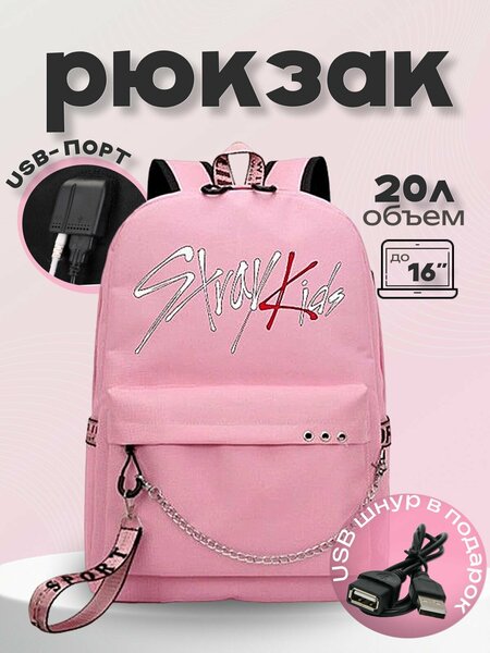 Рюкзак STRAY KIDS с цепью, внутри рюкзака есть несколько отделений. Подойдет для школы, университета и повседневного ношения. На боковой поверхности рюкзака есть USB вход для наушников и зарядки (провода идут в комплекте). Особенности: дышащий материал, снижает нагрузку на плечи и спину. Объем: 35 л. Маркировка: Ichi. Размер: 44*30*15 см. Цвет: Розовый