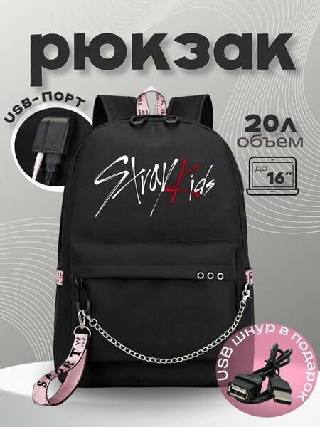 Рюкзак STRAY KIDS с цепью, внутри рюкзака есть несколько отделений. Подойдет для школы, университета и повседневного ношения. На боковой поверхности рюкзака есть USB вход для наушников и зарядки (провода идут в комплекте). Особенности: дышащий материал, снижает нагрузку на плечи и спину. Объем: 35 л. Маркировка: Ichi. Размер: 44*30*15 см. Цвет: Черный
