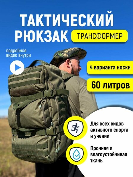 Рюкзак тактический мужской в стиле милитари становится популярным среди людей, занимающихся различными видами активного отдыха и спорта. Цвета хаки, такие как зеленый, не только придают рюкзаку стильный вид, но и делают его универсальным. Рюкзак черный - это база, но болотный камуфляж не уступает в современном мире. Наш Тактический рюкзак 4 в 1 – это специализированная сумка, разработанная с учетом потребностей людей, ведущих активный образ жизни и выполняющих военные задачи. Основные преимущество: возможность индивидуальной настройки. Походный рюкзак можно носить 4мя способами (смотрите фото и видео). Один из которых - на плече как сумку, благодарю большой съёмной ручке. Смело используйте его как рюкзак туристический или как вещмешок. Объем изделия 60 литров. Необычайно вместительный. Большой ранец имеет огромное количество карманов и скрытых отсеков разного размера - удобно разместить необходимые вещи. Особенно важно для путешественников. Если ищете рюкзак для путешествий помещающийся в ручную кладь - тестировали и брали его в самолет. Прочная и водоотталкивающая ткань Кордура не боится износа. Рюкзак тканевый идеален для использования в сложных условиях. Поддержка поясного ремня делают переноску комфортной, а это просто необходимо взрослому человеку который бережет спину поднимаясь в горы, например. Попробуйте на ПВЗ, как сидит рюкзак, накиньте через плечо. Если вы берёте его как военный или охотничий, Вы должны прочувствовать что он не давит. Назначение: Спортивное. Позволяет удобно разместить спортивное оборудование: кроссовки, одежду, бутылки с водой и спортивные аксессуары. Городской и дорожный. Рюкзаки в цветах милитари легко сочетаются с повседневной одеждой. Вы можете носить его на работу, учебу или прогулки по городу. Туризм и рыбалка. Мы лично используем как рюкзак непромокаемый для рыбалки. Рюкзак рыболовный большой и помещает снасти. Если Вы не знаете что подарить мужу или парню - это идеальный подарок мужчине. Он найдёт где его применить.