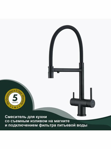 Смеситель для кухни с подключением к фильтру с гибким силиконовым изливом S70.63.06. Изготовлен из высококачественной нерж стали. Данный материал безопасен для здоровья, прочный и стойкий к коррозии. Покрытие смесителя создает гладкую полуматовую поверхность, которая эстетично выглядит, не оставляет пятен, не окисляется. Смесители для кухни с гибким изливом имеют необычный внешний вид и особую конструкцию. Нижняя часть представляет собой обычный однорукий латунный смеситель с регулировкой холодной и горячей воды, регулировкой напора и переключателем на фильтр с другой стороны. Верхняя часть это гибкий излив из пищевого силикона. С его помощью можно самостоятельно регулировать глубину выноса и высоту излива, что решает проблему при наполнении раковины посудой. Смеситель поворачивается на 360 градусов и оснащен отдельным выходом для фильтрованной воды. Переключение на воду из фильтра осуществляется переключателем с керамическим картриджем. Для монтажа достаточно иметь под рукой базовый набор инструментов. В уходе смеситель прост, как и в установке. • Материал - нержавеющая сталь SUS304 • Цвет - черный • Керамический картридж 35мм - S500.358 • Переключатель с керамическими пластинами (угол поворота – 90°) - S501.524 • Аэратор - R540.09.06 • Аэратор для фильтрованной воды - S540.724.06 • Переходник для соединения со стационарной системой питьевой воды - S599.01 • Гибкая подводка 50см - M10*1-Г1/2 • Крепежная гайка - S599.02