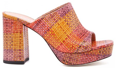 Босоножки выполнены в виде мюли с открытым носком, что добавляет легкости и женственности образу. Верх изделия изготовлен из телячьей кожи с плетеным принтом, что придает обуви уникальность и изысканность.