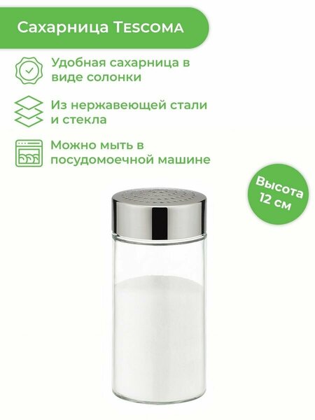 Сахарница Tescoma CLUB изготовленная из стекла и нержавеющей стали подойдет к любому интерьеру. - Материал: изготовлен из первоклассной нержавеющей стали и стекла. - Уход: можно мыть в посудомоечной машине - Гарантия: 3 года. - Компания Tescoma является лидером на мировом рынке изготовления кухонной утвари. Покупая посуду европейской торговой марки Tescoma, вы можете быть уверены в качестве продукции, а также в удобстве применения. Изделия этой компании можно купить в более чем 100 странах мира.