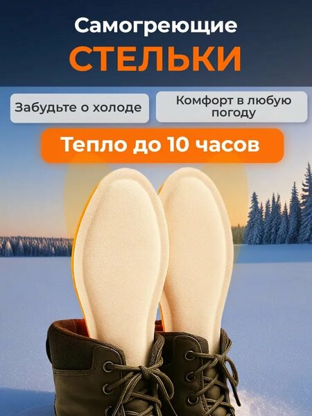 Самонагревающиеся одноразовые стельки для обуви. Активируются при контакте с воздухом, сохраняют тепло до 10 часов. Подходят для зимней обуви, холодной погоды, работы и прогулок на улице.